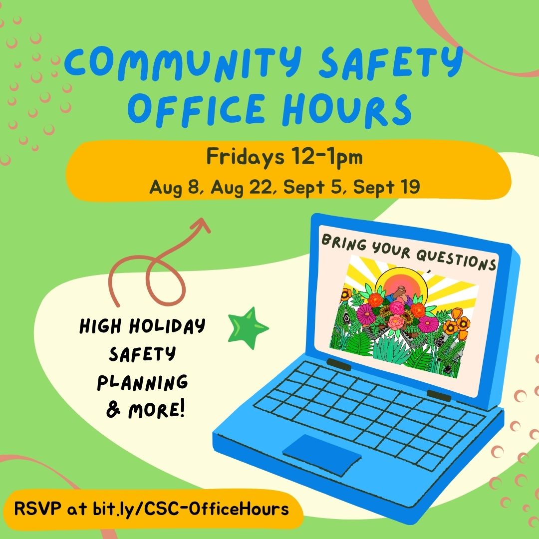 We hosted safety planning Office Hours on alternate Fridays from 12-1pm ET leading up to High Holidays in 2025 – Aug 8, Aug 22, Sept 5, and Sept 19. Stay tuned for future office hours sessions!